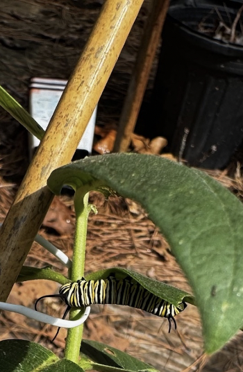 Although I’m always hopeful I’ll see monarchs, after I planted milkweed in the fall of 2018, and had great success with them in 2019 (lots of caterpillars on my plants), each year I would see fewer and fewer, and those I did see died before pupating, prey to insects like tachinid flies, predatory stink bugs, etc. etc. So I promised myself that next time I saw healthy monarch caterpillars in my yard I would do what I could to keep at least some of them safe. Luckily, I had a butterfly cage that was big enough for the two plants. (NOTE: I’ve never used it to cage butterflies.)