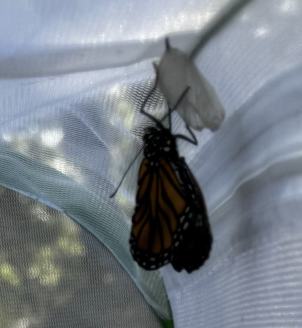I watched the caterpillars for almost two weeks. They were the same size. Siblings, perhaps? They pupated within 24 hours of each other. I had never seen a monarch pupa before and was surprised at how small they are—only about an inch long. On the 13th day, right on schedule, when I checked them in the morning their chrysalises had become transparent. As the day went on, more and more of the butterfly became visible, until—a head and then legs came out the bottom, followed by the crumpled wings, and the abdomen last. They eclosed within three minutes of each other.