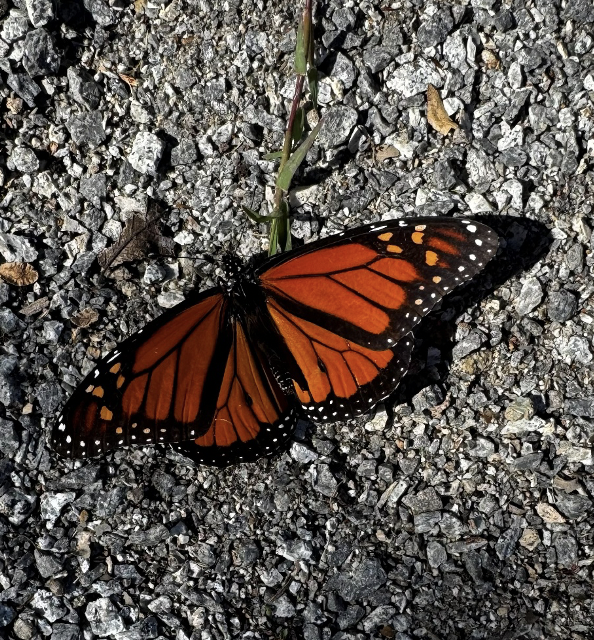 How life gets through the winter is fascinating. Some alternatives are as an egg (walking sticks), a larva (Woolly Bear caterpillars), a pupa (Silver-spotted Skipper), or an adult (Mourning Cloak). Or heck, just fly to Mexico (Monarch). Sleep under the ground (fireflies), or on the ground but under a blanket of dead leaves (Luna Moth), if you’re lucky enough to live in a space where people leave the leaves. Trust that someone won’t burn you or throw you in a chipper. |  | | Photo above: Walking sticks overwinter as eggs. | | Photo above: A monarch on his way to Mexico. | Arkansas summer, the longest of the seasons, is tenacious and today as I write the temperature is summery, although most leaves have turned brown and have fallen. We’ve already had our hard frost, although summer has temporarily clawed her way back. I hope you will leave your yard so as so help and not hinder overwintering life. | |
