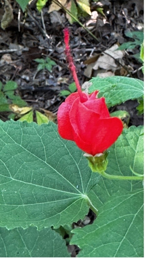Photo: Turk’s Caps bloom until hard frosts arrive. | | | Photo above: Winged sumac fall colors. | I still glance reflexively outside the window at my hummingbird feeder, but it’s been unused for more than a month, and I need to take it down soon. My first winter birds have just started to appear; I saw my first-of-season Ruby-crowned Kinglets and White-throated Sparrows last week. The week before that, a huge flock of Common Grackles perched in my trees and greeted my walking outside into the yard with a raucous chorus of cackles and jeers. That night, two Barred Owls serenaded each other in my yard after dark. When I went outside to hear them better they flew away on noiseless wings, but their songs were followed by the yodeling of a pack of Coyotes.