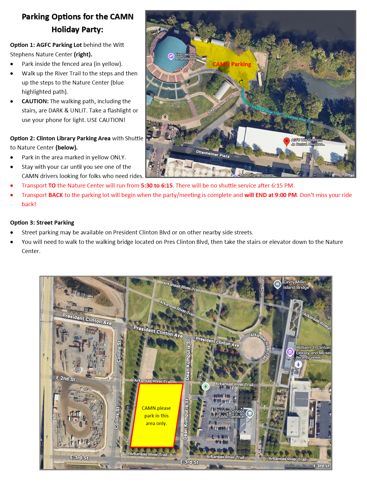 - ABOUT PARKING: We don't want anyone NOT to come because they are worried about parking, so here's a hard-to-beat plan. The small parking lot behind the Nature Center will be open, but it does fill up fast. You can of course park wherever you can find a place that works for you - on the street or in a deck. But please know you can park at the Clinton Library per the diagrams below, and catch a ride in on one of our CAMN shuttles! No walking alone under the bridge or in the dark on poorly lit walkways - we will get you to the front door of the Nature Center! Please read the information below, and make your plans to attend this fun, last-of-the-year event!